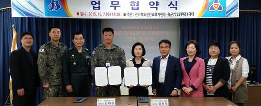 진안교육지원청(교육장 김귀자)은 육군 제7733부대 1대대(대대장 김대성)와 지난 7일 학생 진로체험 및 나라사랑 마음 교육 활성화 체제 구축을 위한 MOU를 체결하였다.