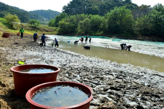 12일 백양마을(이장 유양종) 주민과 예비군중대, 강호항공고 학생 등 100여 명은 백양1저수지에서 전통보존을 위한 고기잡이 체험에 나섰다.