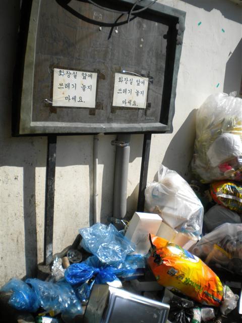 또 ‘화장실 앞에 쓰레기를 놓지 마세요’라는 팻말이 무색하게도 바로 앞에 각종 쓰레기봉투가 어지러이 널려 있었다. 남부시장 청년몰로 이어지는 입구 쪽에 위치한 화장실 역시 사정은 마찬가지였다.