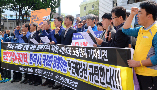 민주노총 전북본부와 전농 도연맹, 전교조 전북지부 등 전북지역 38개 시민사회단체로 구성된 전북시민사회노동단체는 15일 성명서를 내고 “유신의 부활을 선언한 ‘역사교과서 국정화’는 민주시민의 힘으로 반드시 백지화 시켜야 한다”고 주장했다.