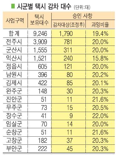 현재 도내에는 개인 5721대, 법인 3525대 등 총 9246대의 택시가 운행중으로, 전체 운행택시의 19.4%가 자율 감차 대상이다.