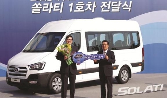 현대자동차(주)는 19일 전주 상용차공장에 신축한 홍보관에서 미니버스 쏠라티 1호차 주인공으로 국내 광고계가 주목하는 젊은 CEO인 상화기획(주) 정범준 대표(41)를 선정해 전달식을 가졌다.