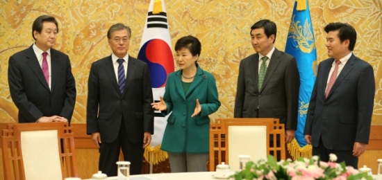 ▲ 박근혜 대통령과 새누리당 김무성 대표 원유철 원내대표, 새정치민주연합 문재인 대표 이종걸 원내대표가 22일 오후 3시 청와대에서 회동하고 있다. 연합뉴스