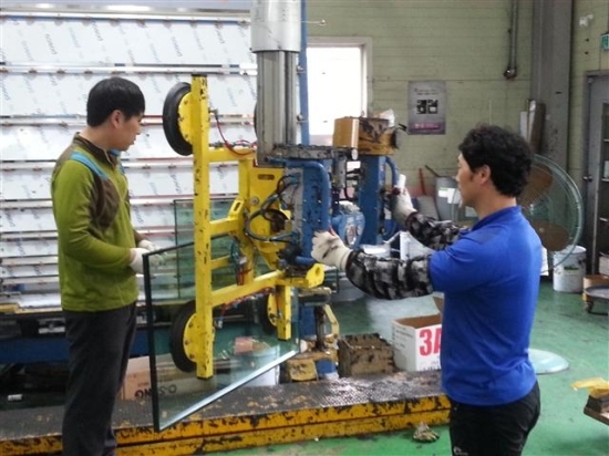 ▲ 전주시 덕진구 팔복동에 위치한 (주)금강유리 공장에서 직원들이 유리 공정작업을 하고 있다.