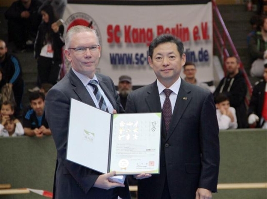 ▲ 유럽순회 태권도시범단 서창훈(우석학원 이사장) 단장이 지난 달 31일 독일 베를린 마이클 뮐러 시장에게 국기원 명예단증을 전달하고 있다.