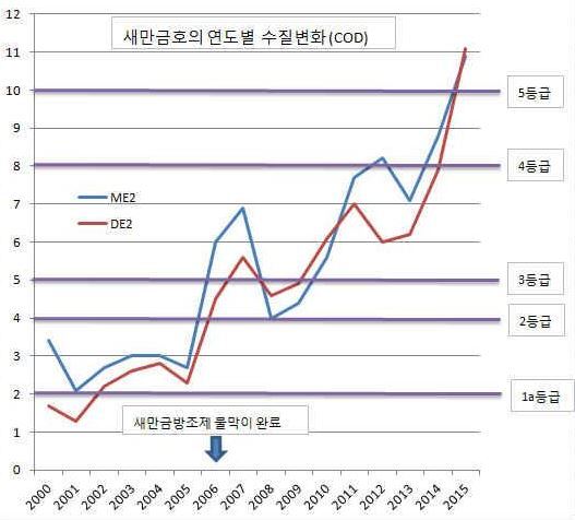 이달 말 새만금 수질 중간 평가를 앞두고 있는 상황에서 새만금 호의 평균 수질은 COD와 T-N 수치가 평균 5급수 수준이다. 새만금호의 13개 수질측정지점 중 새만금호 중간 수역의 6개 지점은 6급수 이하다.