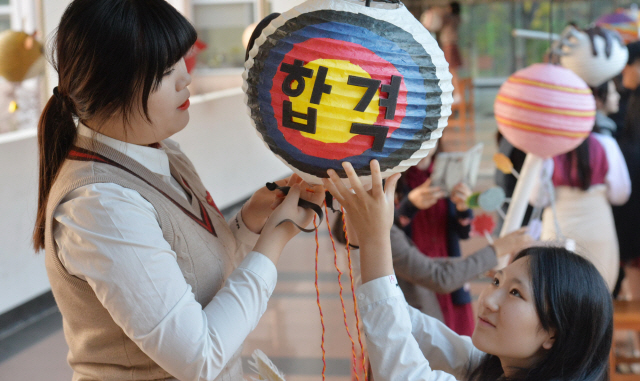 2016학년도 대학수학능력시험을 일주일여 앞둔 4일 전주 유일여자고등학교에서 재학생들이 수험생들을 응원하며 수능대박기원등을 달고 있다.