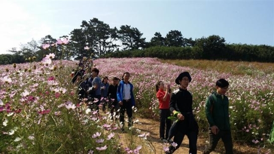 ▲ 길 양 옆으로 코스모스밭이 조성된 부안마실길을 걷고 있는 방문객들. 사진 제공=부안군