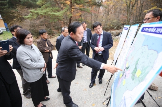 무주 태권도원에서 2017 무주세계태권도선수권대회 준비상황을 파악한 뒤 진안군 백운면에 위치한 지덕권 산림치유원 예정부지로 자리를 옮겨 사업추진 과정에서 애로사항과 예산확보의 어려움 등을 파악했다.