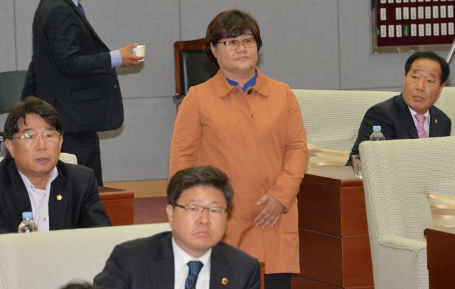 통합진보당 해산 결정 이후 의원직이 상실된 옛 통진당 이현숙 전 도의원이 의정활동 재개의 뜻을 밝힌 가운데 제326회 도의회 정례회 후 신상발언을 위해 단상으로 걸어 나오고 있다.