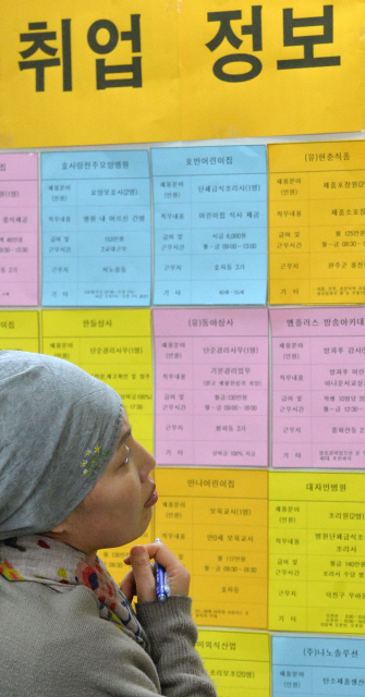 미취업자와 함께하는 ‘새일 만나는 날’ 행사가 10일 전주여성인력개발센터에서 열린 가운데 한 여성이 취업 게시판을 유심히 바라보고 있다.