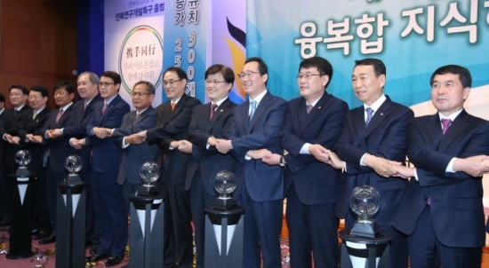 ▲ 12일 전북도청 대회의실에서 '농생명 첨단소재산업의 세계일류 융복합 지식허브'란 슬로건으로 열린 전북연구개발특구 출범식에 최양희 미래창조과학부 장관과 송하진 도지사, 김차동 특구재단 이사장 등 참석자들이 전북특구 비전을 선포하고 손을 맞잡고 있다. ·사진제공 = 전북도