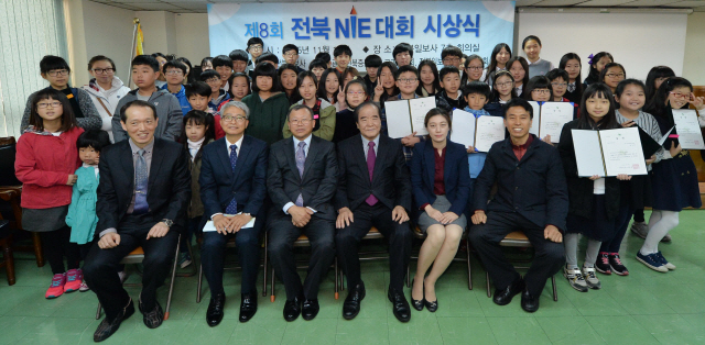 제8회 전북NIE대회 시상식이 열린 14일 전북일보사 7층 회의실에서 윤석정 전북일보사 사장과 김경호 도교육청 교육국장을 비롯한 수상자들이 기념촬영을 하고 있다.