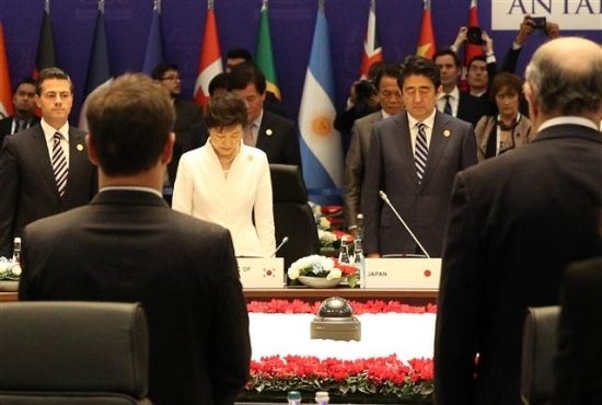 ▲ 박근혜 대통령 등 각국 정상들이 15일 오후(현지시간) 터키 안탈리아 레그넘 호텔 컨벤션센터에서 열린 G20 정상회의 제1세션에 앞서 파리 테러를 추모하는 묵념을 하고 있다. 연합뉴스