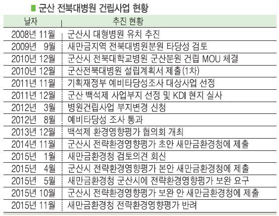 군산 전북대병원 건립사업은 지난 2008년 군산시가 대형병원 유치를 추진하면서 시작됐다. 시는 이듬해 3월 관련 태스크포스팀을 구성해 타당성 검토를 진행한 뒤 지난 2010년 전북대병원과 본격적인 협의에 들어갔으며, 관련 업무협약까지 채결했다.