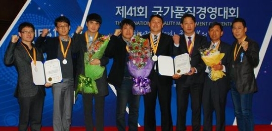 ▲ 지난 18일 코엑스 오디토리움에서 열린 ‘제41회 국가품질경영대회’에서 우수분임조상 은메달을 수상한 한국지엠 군산공장 2개 분임조 직원들이 기념촬영을 하고 있다.