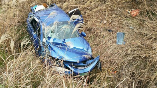 4명 태운 승용차 고속도로 밖 튕겨나가 전복 / 차체 종잇장처럼 구겨졌지만 모두 찰과상만