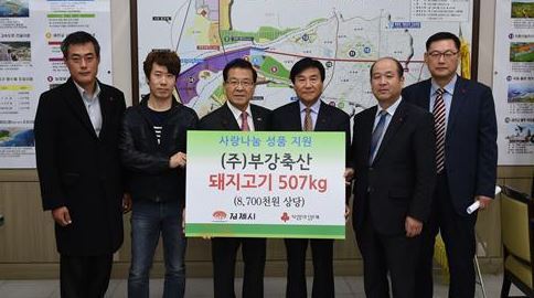 올해의 경우 1호 기부자로 (주)부강축산(대표 김기남)이 23일 김제시청을 찾아 관내 저소득층에 전달해 달라며 양념불고기 161팩(시가 861만원 상당)을 전달했다.