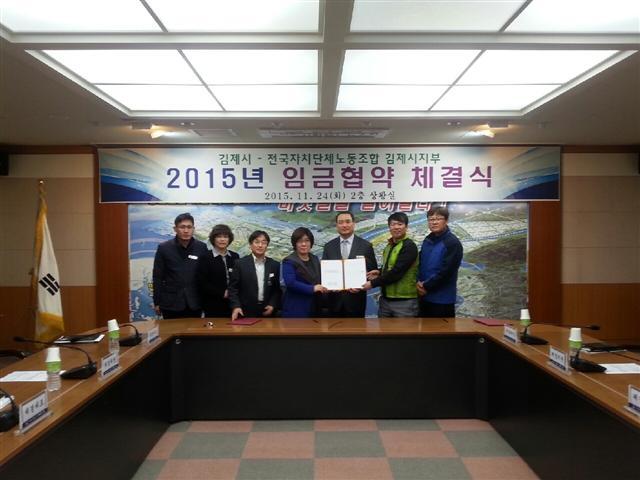 김제시와 전국자치단체노동조합 김제시지부는 지난 4월9일 2014년 임금협상을 체결한 이후 올해가 지나가기 전에 2015년 임금협상을 마무리하기로 합의한 후 이날 임금협약을 체결한 것.