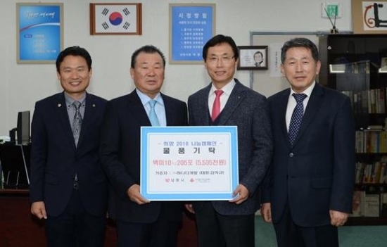 ▲ 남원시와 전북사회복지공동모금회가 진행하는 ‘희망 2016 나눔캠페인’의 첫 기부자인 하나다개발(주)이 쌀을 기증한 뒤 기념 촬영을 하고 있다.