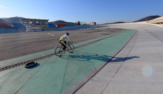 ▲ 8일 전주 경륜장. 한 사이클 선수가 자전거 뒤에 타이어를 매달고 훈련을 하고 있다. 안봉주 기자