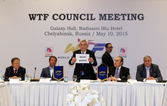 ▲ 세계태권도연맹(WTF)이 지난 5월10일 러시아 첼랴빈스크에서 집행위원회를 열어 2017년 제23회 세계태권도선수권대회 장소를 무주로 확정 발표하고 있다.