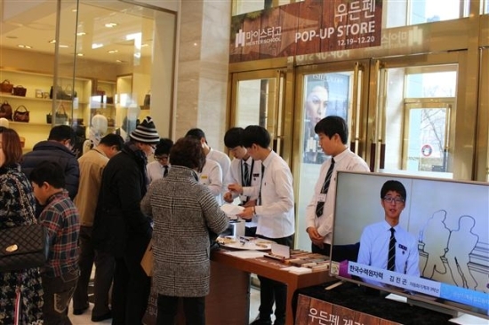 군산 마이스터고 학생들이 지난 19일과 20일 롯데백화점 전주점 1층에 마련된 판매대에서 직접 만든 우든펜(나무를 이용해 만든 펜)을 판매하며 창업의 꿈을 키웠다.