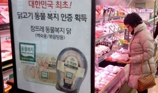 ▲ 참프레 동물복지인증 닭고기가 진열된 매장에서 소비자가 제품을 고르고 있다.