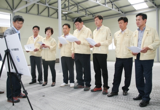▲ 무주군의회 의원들이 지난 6월 목재 팰릿 공장을 방문해 관계자로부터 설명을 듣고 있다.