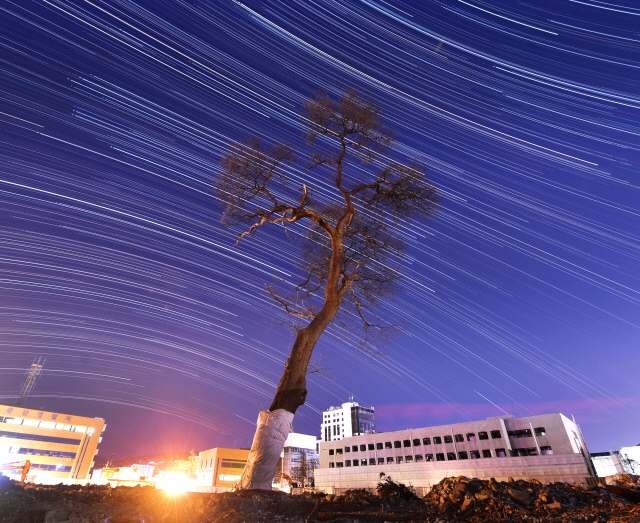 1921년 일제강점기에 지어져 2005년까지 사용됐던 옛 도청사가 철거되고 조선시대 전라도와 제주도를 아우르던 전라감영으로 재탄생하기 위한 복원작업이 진행 중이다. 철거된 옛 도청사 터에 홀로 남은 회화나무는 추위와 어둠을 견뎌내며 새 전라감영을 기다리고 있다. 전북의 근대 역사와 함께한 회화나무 위로 밤하늘의 별들이 흐르며 병신년(丙申年) 새롭게 시작될 역사를 비추고 있는듯하다. 새해는 보다 많은 희망이 이뤄지기를 기원해 본다. 30초에 걸쳐 400장을 촬영해 합성.