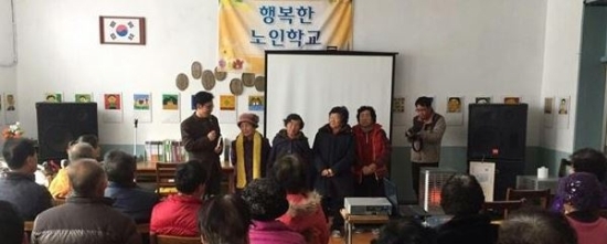 진안군 동향면 행복한 노인학교는 2008년 1월에 개강하여 50여명의 학생들로 시작해 현재는 20여명 정도가 참여하고 있으나 수업의 깊이와 열정은 여느 명문대 못지 않다.