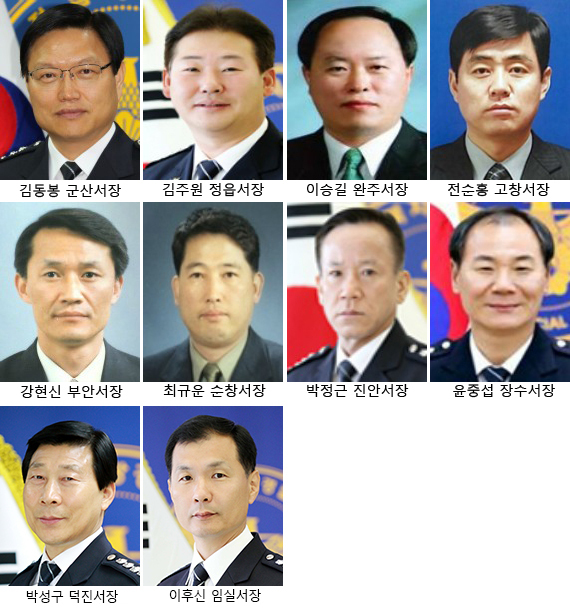 도내 일선 서장 인사에서는 △전주 덕진서장에 박성구 전북청 형사과장 △군산서장에 김동봉 경무과장 △정읍서장에 김주원 생활안전과장 △완주서장에 이승길 보안과장 △고창서장에 전순홍 치안지도관 △부안서장에 강현신 청문감사담당관 △순창서장에 최규운 치안지도관 △진안서장에 박정근 112종합상황실장 △장수서장에 윤중섭 홍보담당관 △임실서장에 이후신 충남청 홍보담당관이 각각 자리를 옮겼다.
