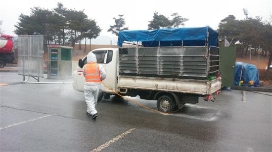 ▲ 남원시가 구제역의 유입을 차단하기 위해 설치한 거점 소독장소에서 축산 관련 차량에 소독을 하고 있다.