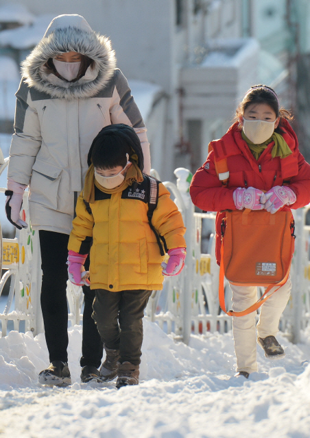 도내 초등학교가 개학을 시작한 25일 영하의 추운 날씨에 목도리와 마스크를 쓴 학생들이 등교하고 있다.