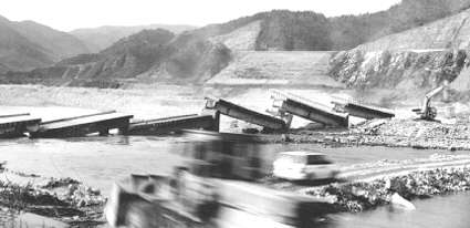 ▲ 진안 용담호 건설 당시 수몰 마을의 다리가 철거되는 모습. 사진제공=용담호 사진문화관