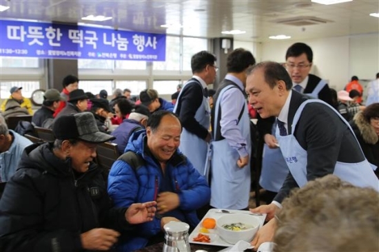 ▲ 전북은행 지역사랑봉사단은 지난달 29일 전주 평화동 꽃밭정이노인복지관에서 ‘따뜻한 밥상 떡국 나눔’행사을 실시한 가운데 임용택 은행장이 떡국을 나르고 있다.