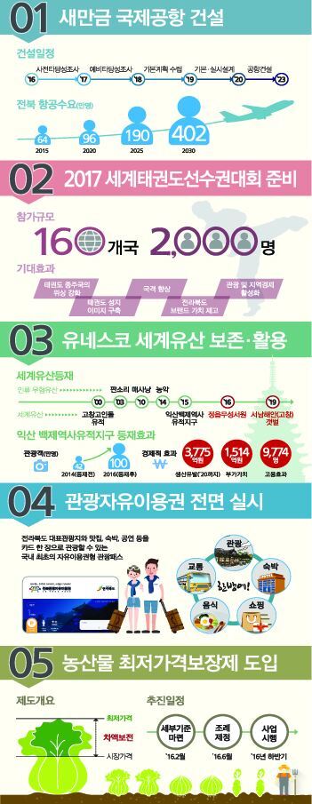 2016년 전북도정은 10대 핵심 프로젝트에 방점이 찍혔다. 민선 6기 3대 핵심과제인 ‘농생명, 탄소, 관광’의 세부 사업들로, 지난해 잇단 사업 및 대회 유치성공과 기반구축 등으로 틀거리가 갖춰졌다. 올해는 이들 사업을 중점 육성시켜 지난해 거둔 성과를 가시화시키겠다는 게 전북도의 구상이다. 송하진 전북도지사도 “정치권, 시·군, 시민단체 그리고 200만 도민의 역량을 하나로 결집하여 10대 핵심 프로젝트를 반드시 해결해 나가겠다”며 강한 의지를 피력했다. 올 도정 운영의 흐름을 한 눈에 볼 수 있는 10대 핵심 프로젝트를 살펴봤다.