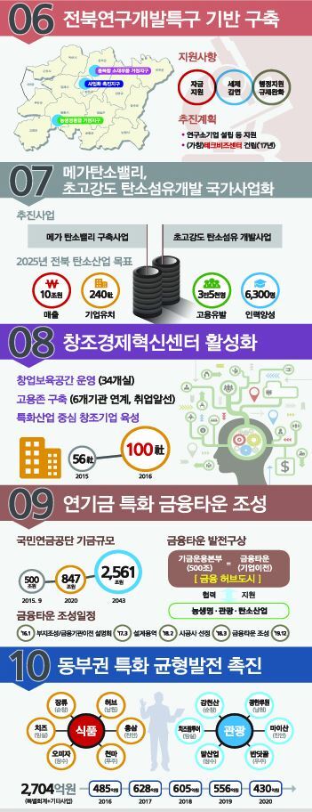 특히 혁신센터 중심으로 지역전략산업 분야 50개 기업을 육성해 전북 창조경제를 이끌어 나간다는 방침이다. 우선 탄소소재 산업 20개 기업 육성을 목표로 탄소소재 가치사슬 확립 및 탄소 밸리 조기 활성화에 나선다. 또 농생명문화 산업 30개 기업을 육성하기 위해 농생명 자산의 고부가가치 상품화, 유무형 전통문화 ICT 융합 활성화, 혁신센터 분원전북생물산업진흥원 보육실 등을 연계하는 창업기업 양성이 중점 추진된다.