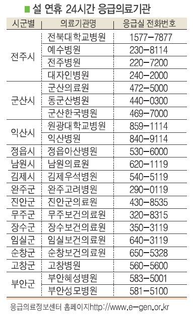 전북대병원과 예수병원, 군산의료원, 원광대병원, 남원의료원, 정읍아산병원, 김제우석병원, 완주고려병원, 진안군의료원, 무주·장수·임실·순창보건의료원, 고창병원, 부안혜성병원 등 21곳은 24시간 응급실을 운영해 긴급환자 발생에 대비한다. 또 2031개 의료기관이 일자별로 진료를 벌인다.