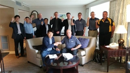 ▲ 전북기업 육성사업 지원을 받은 도내 금성산업이 미국 도로시설 2위 업체인 그레고리 산업과 5년 간 400만 달러 규모의 독점계약을 체결하고 기념촬영을 하고 있다.
