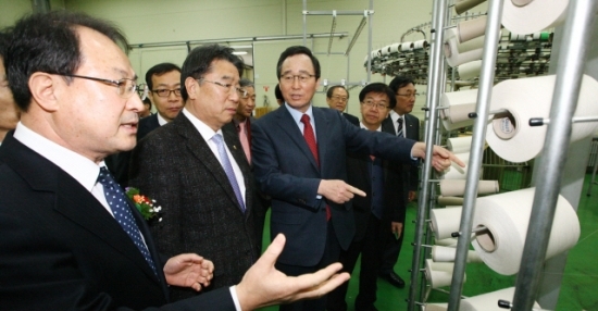 ▲ 17일 익산 제2일반산업단지에 위치한 에코융합섬유연구원 공장동에서 열린 섬유산업 비전선포 및 에코융합섬유연구원 현판식에 송하진 도지사와 김영배 도의회 의장, 백철규 원장 등 참석자들이 연구원 공장시설을 둘러보고 있다. 사진제공 = 전북도청
