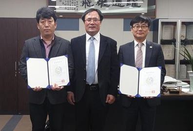 ▲ 21일 정원탁 전북지방중소기업청장(가운데)이 도내 기업인 (주)인텍과 (주)한국건설기술공사의 기술개발제품에 대해 성능인증을 수여하고 기념촬영을 하고 있다.