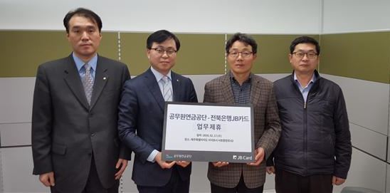 전북은행과 공무원연금공단은 앞서 지난 17일 제주도 서귀포시 공무원연금공단 본사 4층 회의실에서 공단 복지시스템 연동 및 공무원 복지카드 업무제휴 협약식을 가졌다. 양측은 이번 제휴로 신용카드 업무뿐 만 아니라 향후 다양한 분야에서 긴밀한 협력관계 구축을 위해 노력하는데 합의했다.