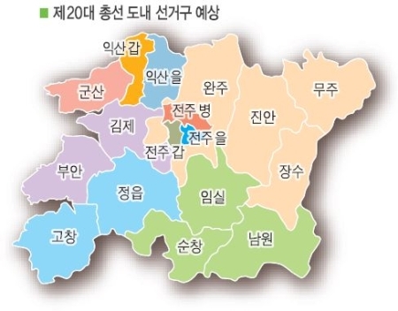 전북의 경우 인구 하한선(14만 명)에 미달하지 않는 전주(3개)와 익산(2개)·군산(1개)은 종전의 선거구를 유지한다. 다만 하한에는 미달하지 않지만 김제·완주 선거구는 분구가 예상된다. 하한에 미달하는 정읍, 고창·부안, 진무장임실, 남원·순창 등의 선거구 획정을 위해서다.