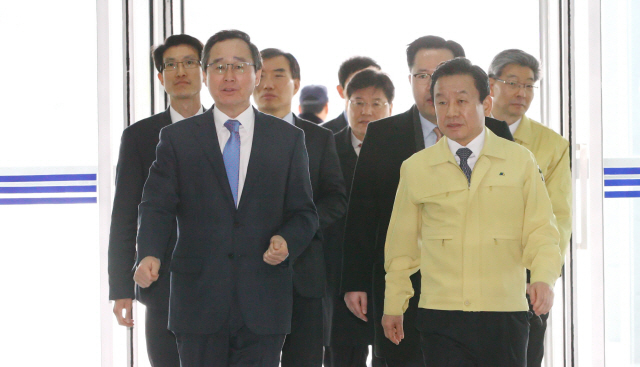▲ 24일 전북도청 종합상황실에서 열린 안전사고 사망자수 감축 및 안전한 지역사회 만들기 간담회에 참석하기 위해 박인용 국민안전처 장관(첫 줄 오른쪽)과 송하진 도지사(첫 줄 왼쪽)를 비롯한 담당자들이 들어 오고 있다. 안봉주 기자