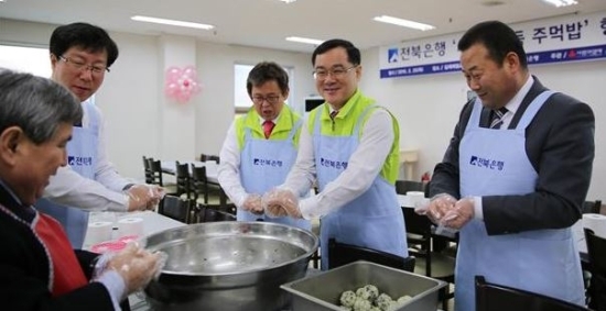 JB금융지주 전북은행지역사랑봉사단(공동단장 임용택 은행장, 최강성 노조위원장)은 25일 김제시 옥산동 김제제일교회에서 어르신 200여명을 초청, ‘제5회 사랑한가득 주먹밥’ 무료급식 봉사활동을 실시했다.