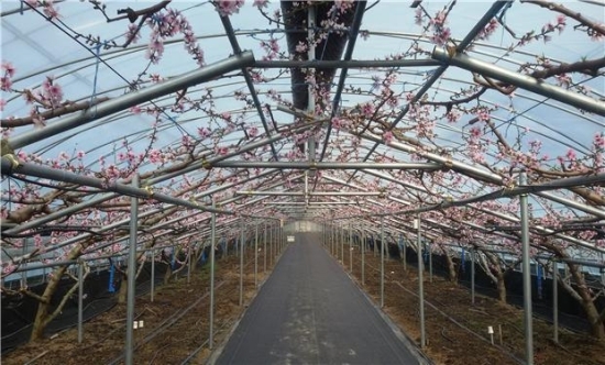 ▲ 남원시 수지면 황덕주 씨의 농장에서 복사꽃이 시설물 지붕을 따라 개화한 모습.