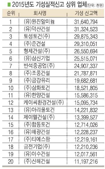 또한 10위권에 (주)세진산업개발(221억1593만2000원)이 6위로 새로 진입했고 항상 상위권을 유지하다 2014년도에 10위로밀려났던 금전기업(주) (197억1929만9000원)은 또 다시 10위권 밖인 18위에 그쳤다.