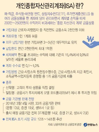 그런 상황에서 ISA(Individual Savings Account)는 각각의 상품별로 계좌를 개설해야 했던 기존 상품과 달리 예금, 펀드, ELS(파생결합증권) 등 여러 업권의 다양한 상품을 한 계좌에 모아 관리할 수 있는 자산관리 상품이라는 것이 금융당국의 설명이다.