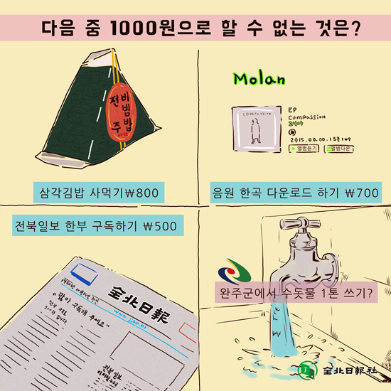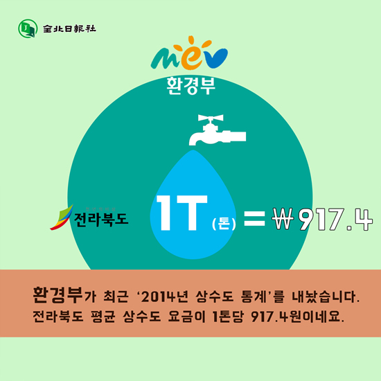 환경부가 최근 '2014년 상수도 통계'를 내놨습니다. 전라북도 평균 상수도 요금이 1톤당 917.4원이네요.